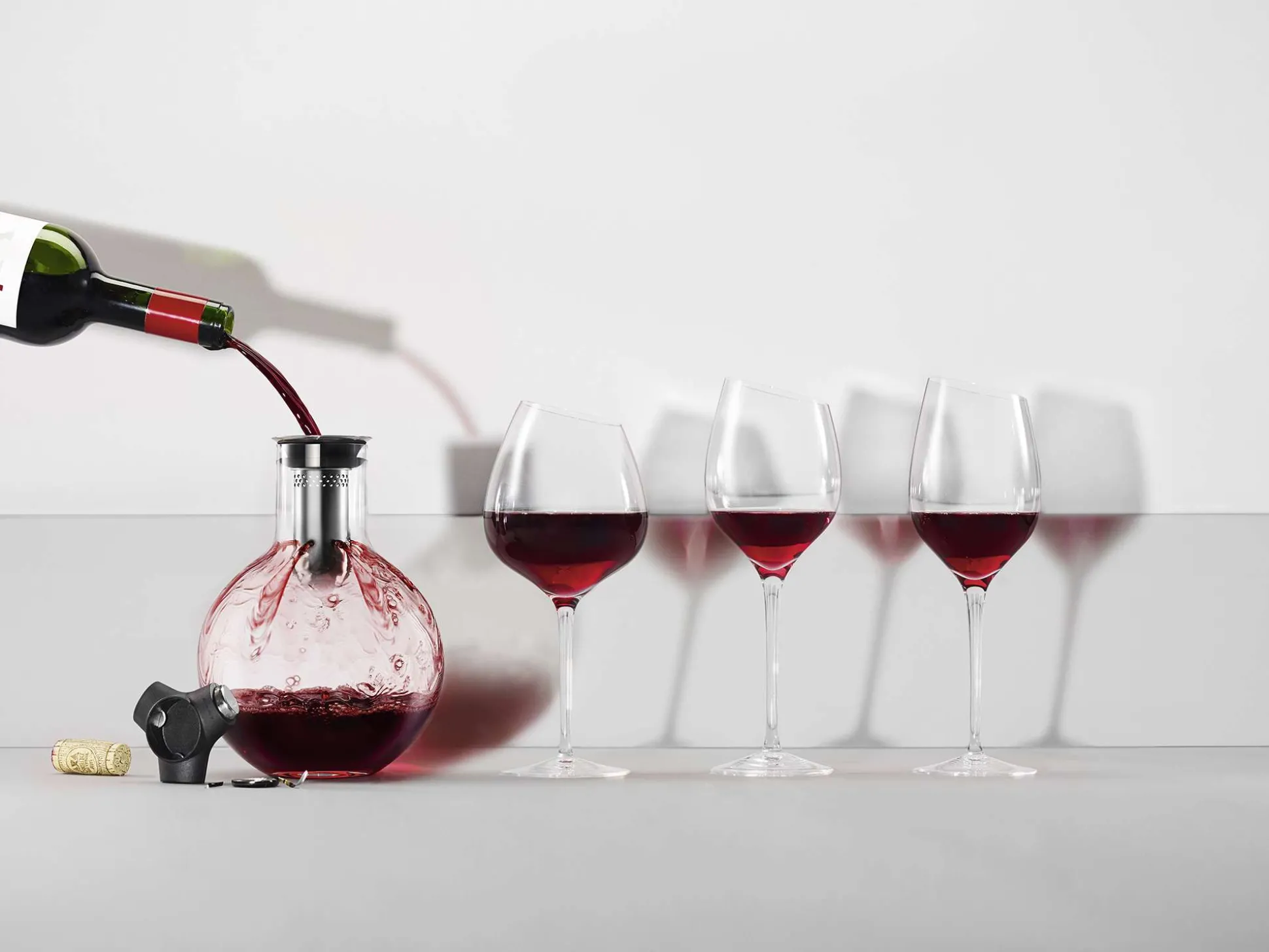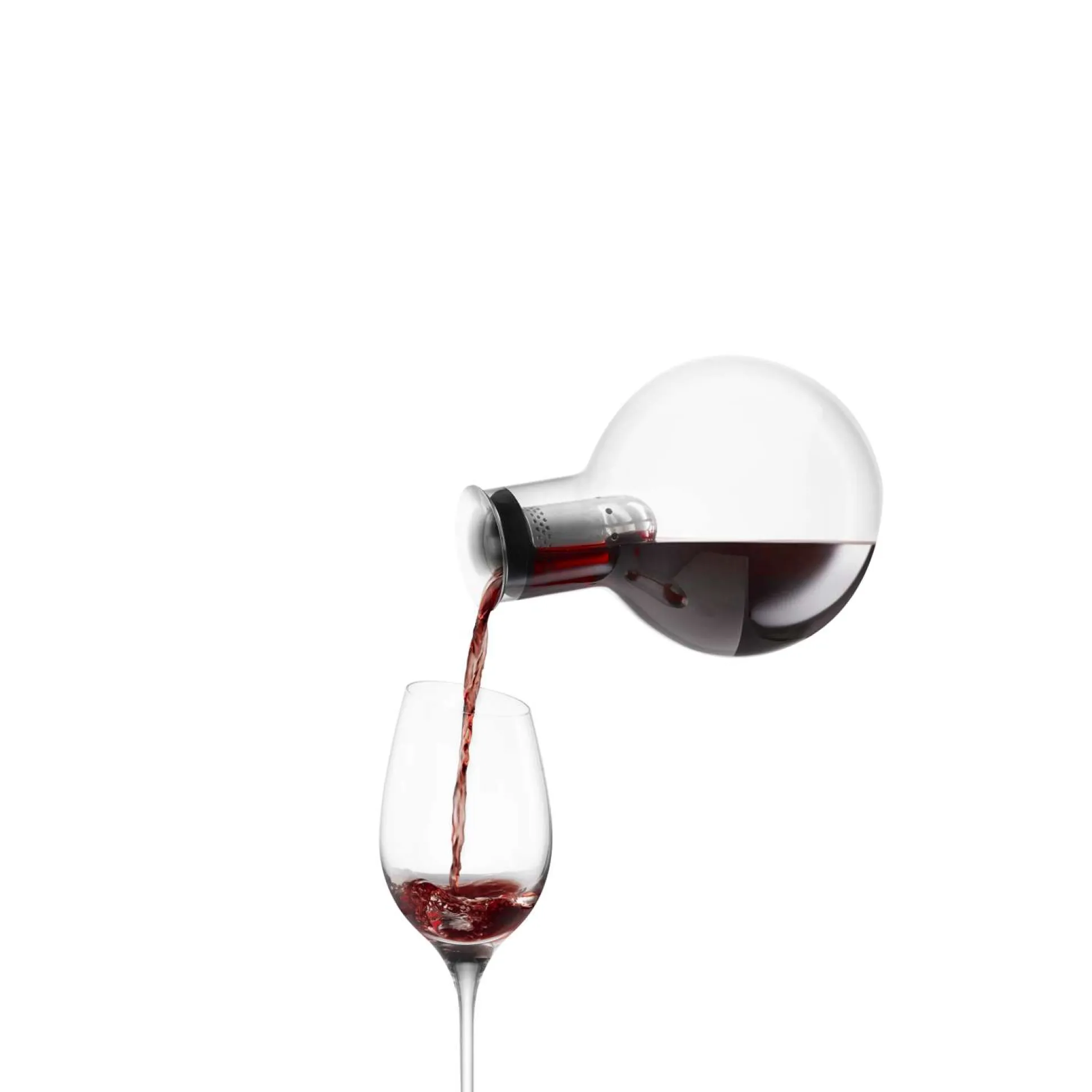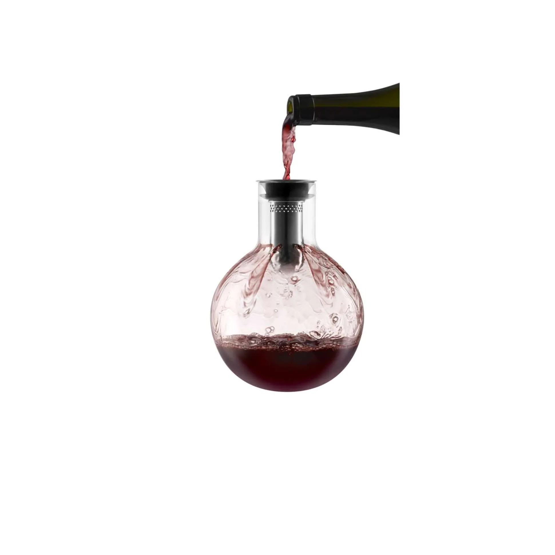 Med dekanteringskaraffen får du fram det bästa ur vinet. När vinet hälls i karaffen rinner det igenom små hål i den integrerade tratten och ner längs karaffens insida. Det gör att vinet luftas varsamt, effektivt och vackert. Karaffen har dessutom en stor yta, vilket påverkar luftningen positivt. Dekanteringskaraffen rymmer en flaska vin och är 100 % droppfri.