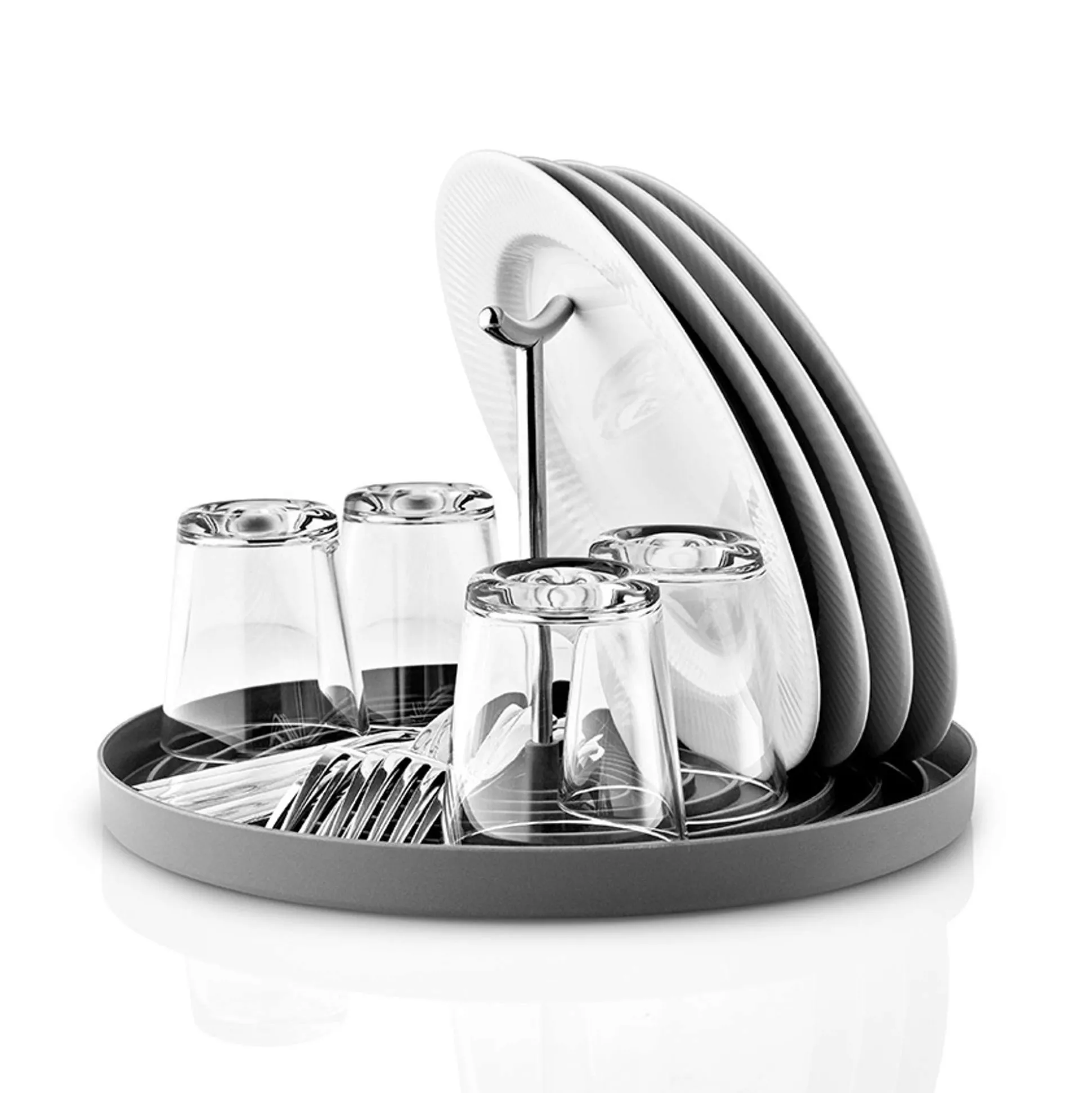 Inga fler dyngsura handdukar eller köksbord. Bekvämt diskställ för hem utan diskmaskin eller för diskning i en handvändning. Droppbrickan samlar allt överflödigt vatten och kan enkelt tömmas i diskhon. Diskstället är tillräckligt för upp till fyra personer och kan enkelt vikas upp för att ta upp minimalt utrymme. Dra upp stången och lägg ner den.