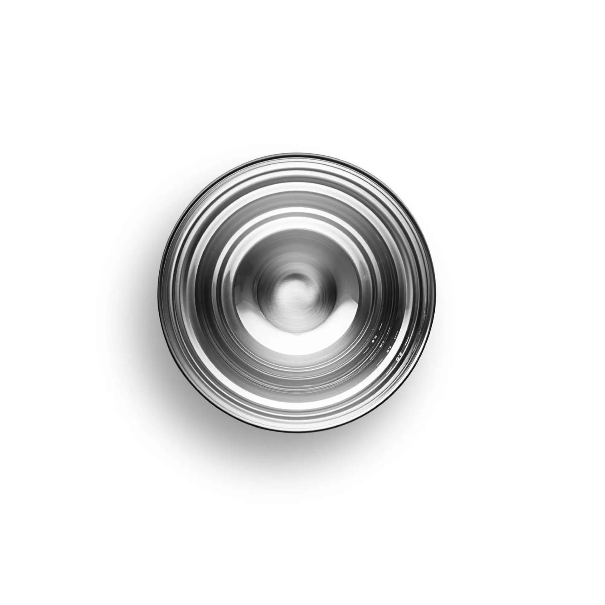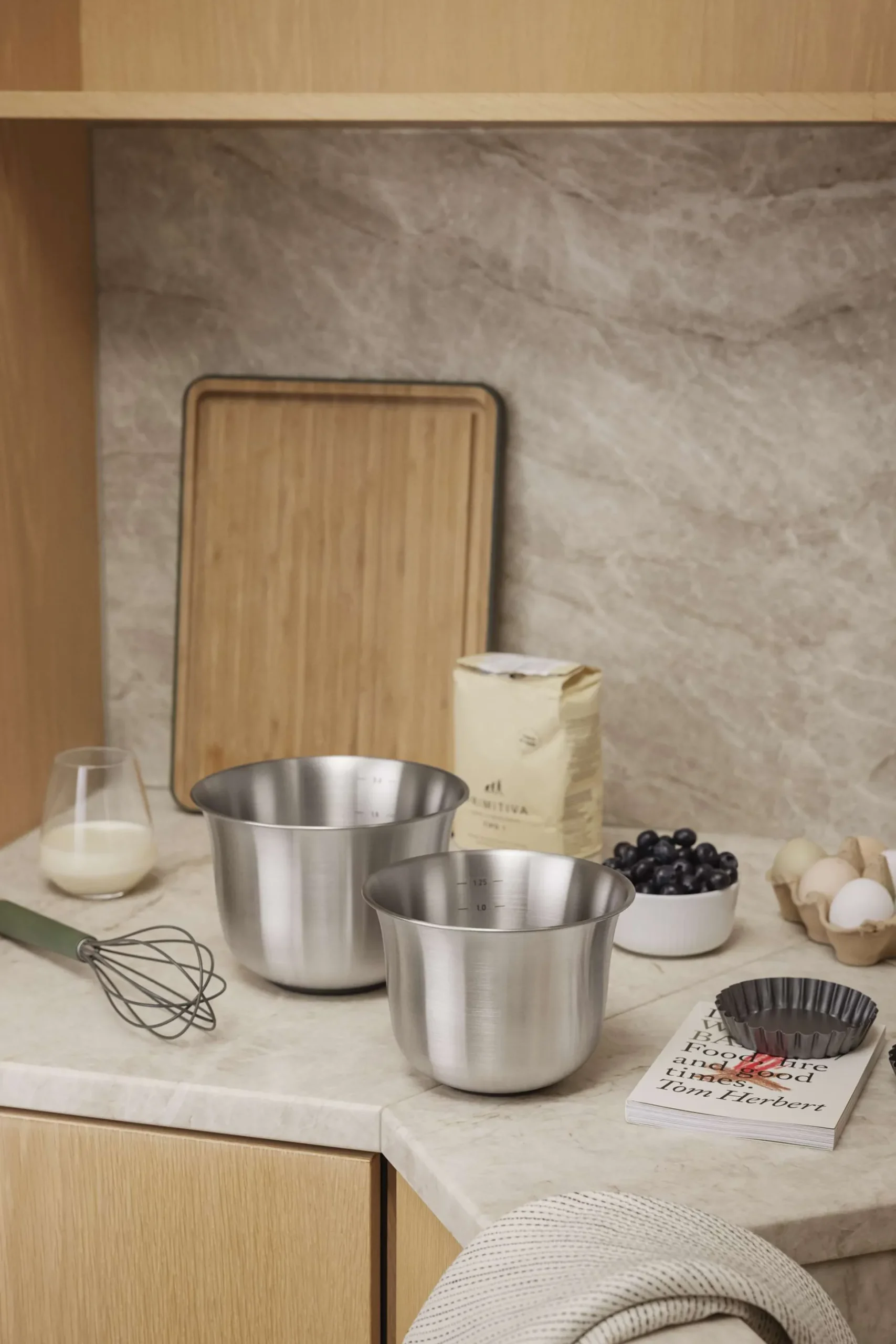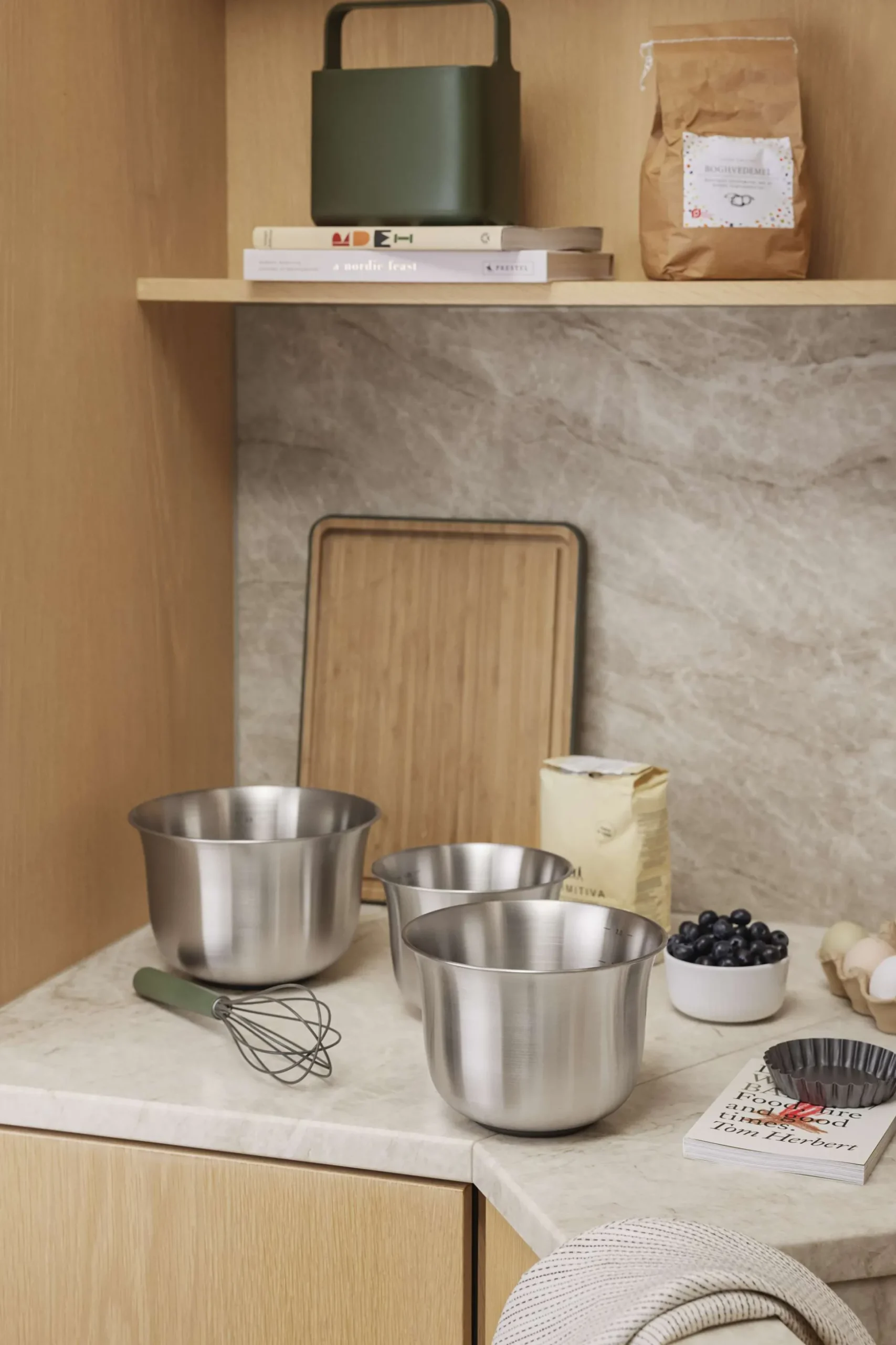 Använd blandskålen för att blanda, vända, knåda eller förvara mat. Skålen är tillverkad av 90 procent recycled post-consumer rostfritt stål, vilket gör den hållbar och motståndskraftig mot stötar, repor och bucklor. Den tål handmixer, visp och andra metallredskap utan problem. En gummiring i botten säkerställer att skålen står stadigt på bänken. Med sin rundade botten och sina höga kanter är skålen perfekt för vispning, och dess förmåga att motstå både höga och låga temperaturer gör att den lämpar sig väl för vattenbad och nedkylning av ingredienser. Rostfritt stål reagerar inte med sura eller basiska livsmedel, vilket gör skålen optimal till förvaring av mat. Invändiga måttmarkeringar gör det enkelt att mäta upp ingredienser direkt i skålen, som dessutom kan staplas för att spara plats i kylskåpet och tål maskindisk.