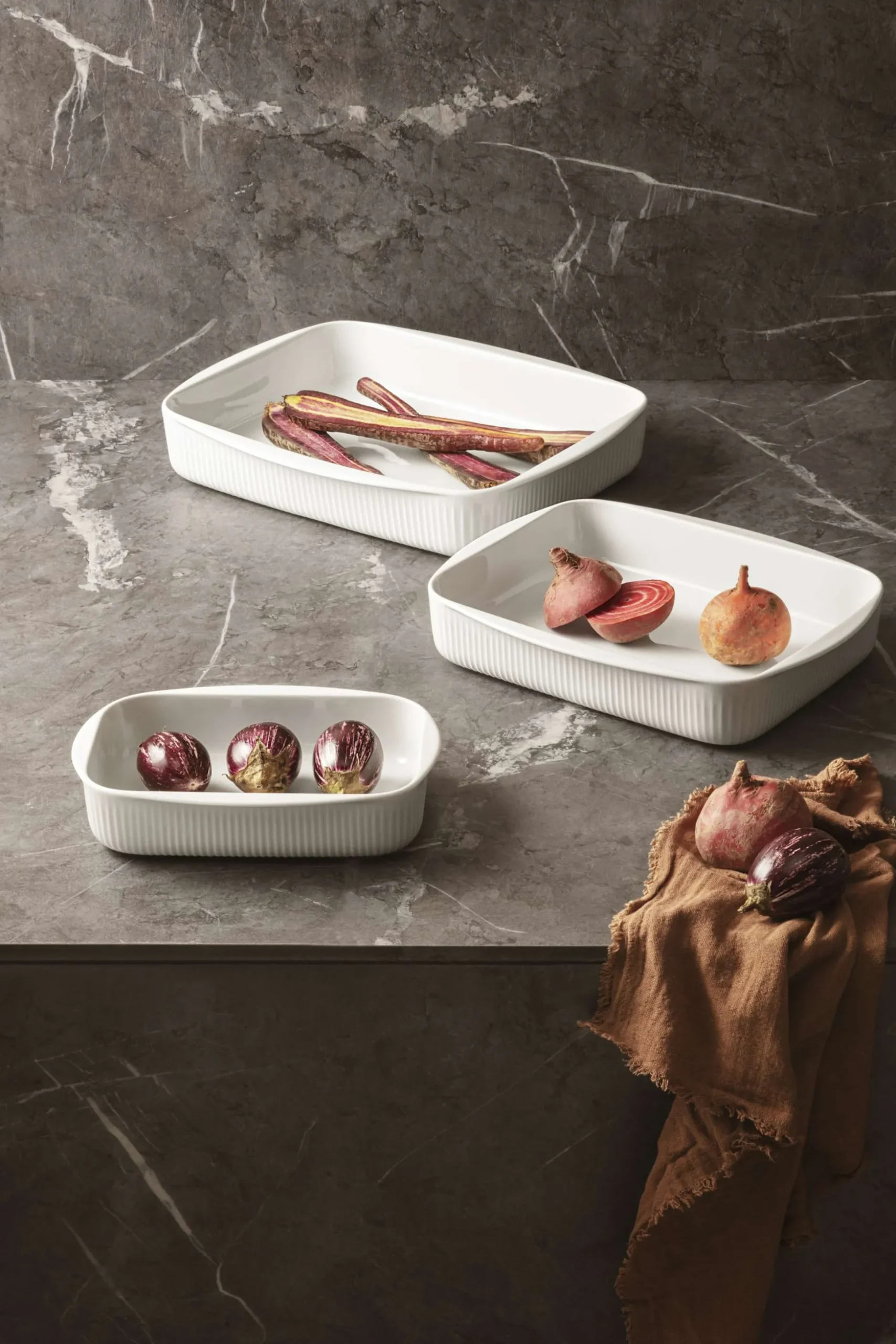 Ugnsfast form med Legio Nova-servisens karakteristiska räfflor pryder bordet samtidigt som de är praktiska med många användningsmöjligheter, från ugns- och grillrätter till frukt och sallad. De platta kanterna ger ett bra grepp och formen kan tas från frysen och ställas i ugnen eller direkt på grillen.